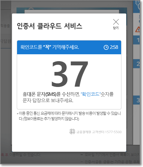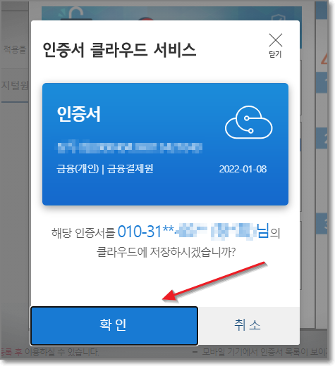 인증서 클라우드 서비스라고 나오고 "해당 인증서를 휴대폰 번호 고객님께"의 클라우드에 저장하시겠습니까?라고 물어봅니다. "확인"을 눌러야죠.