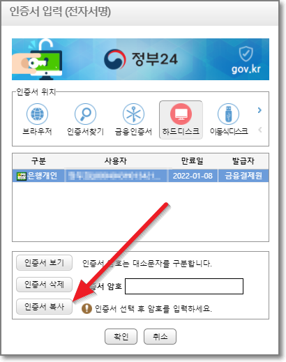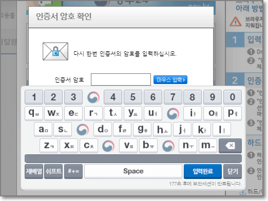 인증서 암호를 키보드로 한번 마우스로 한번 총 2번 입력합니다.