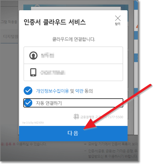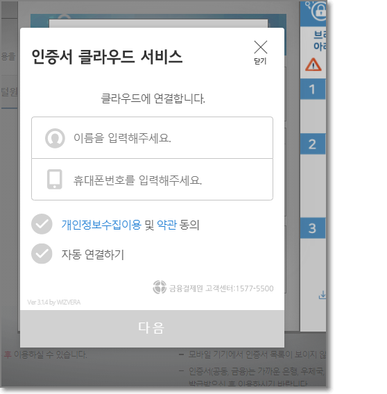 인증서 클라우드 서비스가 나오면 이름과 휴대폰 번호를 입력하고 개인정보수집 이용 및 약관에 동의하고 "다음"을 누릅니다. "자동 연결하기"는 선택입니다.(안 눌러도 됩니다.)