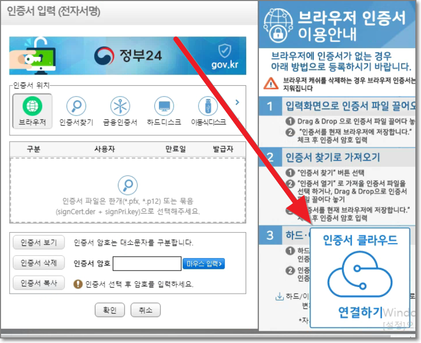 그럼 이제 클라우드에 저장한 것이니까 다른 피시에서도 되야겠죠? 다른 피시에 가서 정부24에 들어가봤습니다. 화면 오른쪽 밑에 "인증서 클라우드 연결하기"를 누릅니다.