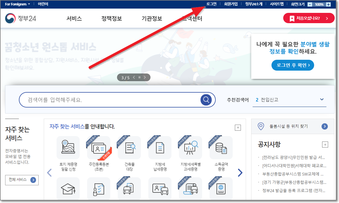 우선 인증서 입력창이 떠야만 작업을 할 수 있으니 주민등록등본을 발급할 때 사용하는 "정부24"로 가겠습니다. 바로가기 누르시면 정부24가 열리고요. 상단 중앙쯤에 있는 "로그인"을 누릅니다.