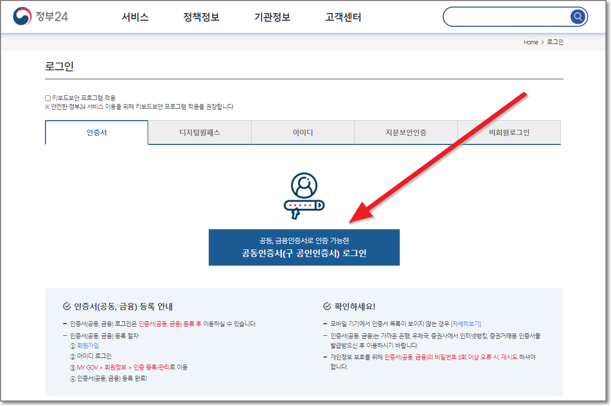 다음 화면에서 화면 가운데 있는 "공동인증서(구 공인인증서) 로그인"을 누릅니다.