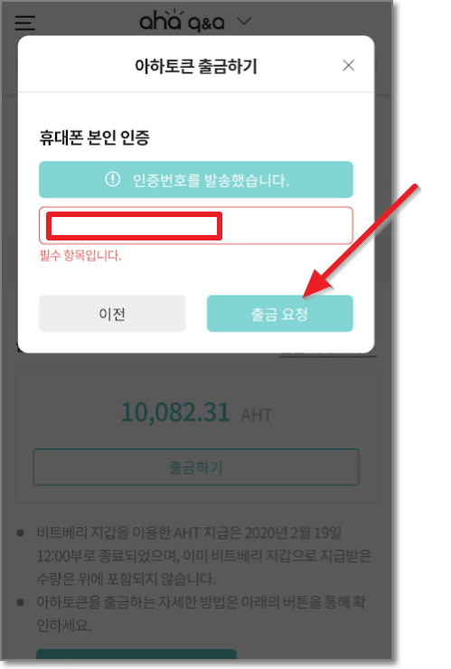 잘 보시면 10000 AHT를 출금하고자 했지만 실제 수량은 수수료 10 AHT를 제하고 9990 AHT인 것을 보실 수 있습니다. 이상태로 "다음"을 누르고 휴대폰 본인인증을 한 다음 인증번호가 오면 입력하고 나서 "출금요청"을 누릅니다.