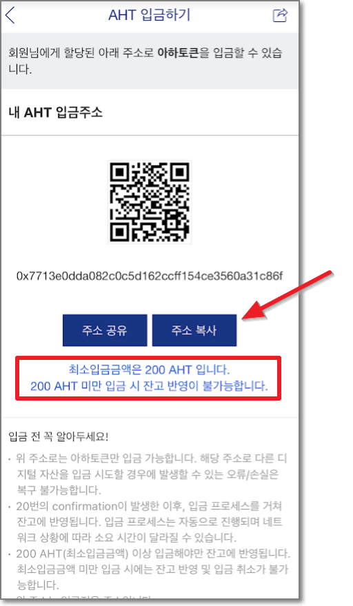 최소 입금액이 200아하라고 하는데요 어차피 아하 사이트에서 5000 이하로는 안 보내지니까 이 문구는 무시하셔도 됩니다. 아래처럼 "주소 복사"를 누릅니다.