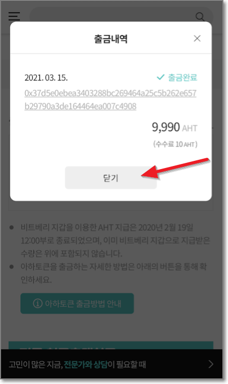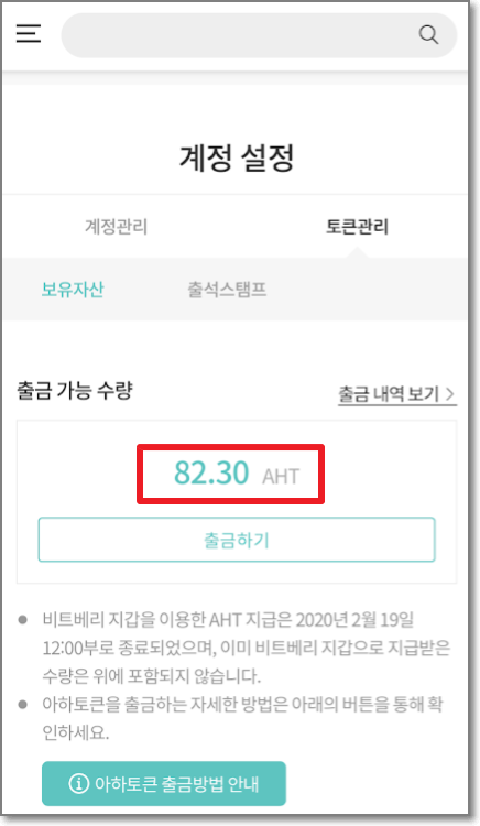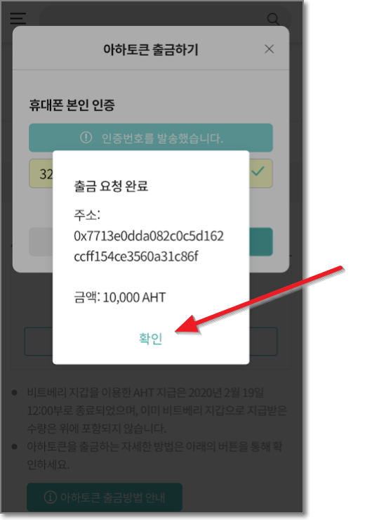 "출금 요청 완료"라는 창이 뜨면서 수수료 10 포함해서 10000AHT를 출금했다고 알려줍니다. "확인"을 눌러보면 이제 82.30 AHT만 남은 것을 보실 수 있지요.