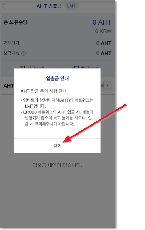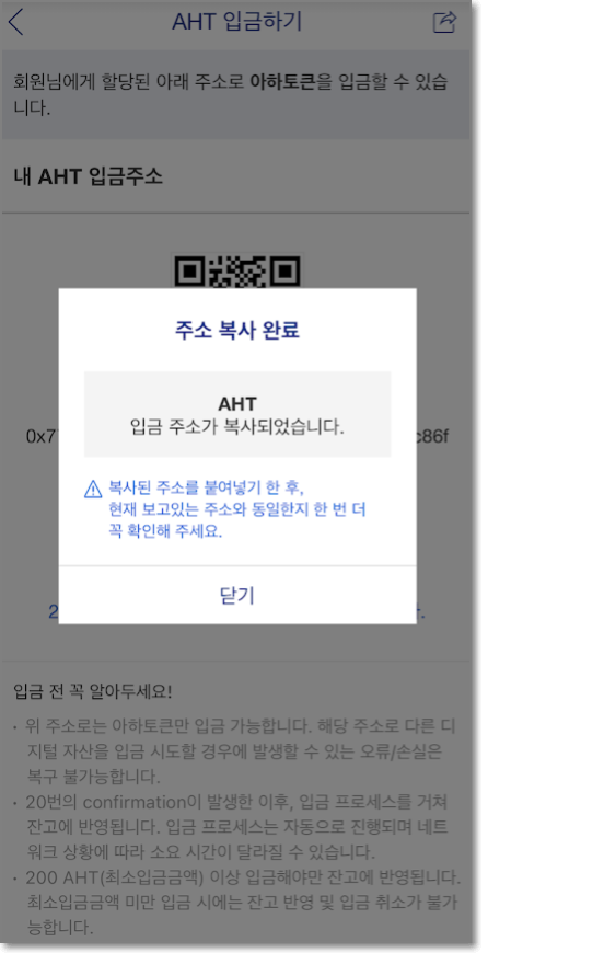 주의사항이 잠깐 나오는데요. 엉뚱한 주소로 보내지말라는 말입니다. "닫기"를 누릅니다. 이제 드디어 "내 AHT 입금 주소"가 나왔습니다. 0x7713e0dda082c0c5d162ccff154ce3560a31c86f 라고 나오는데요. 이건 제 개인 주소입니다. 이쪽으로 입금하시면 제가 받게 되니까 혹시라도 저한테 잘못 보내시면 덧글로 알려주시면 돌려드리도록 하겠습니다.