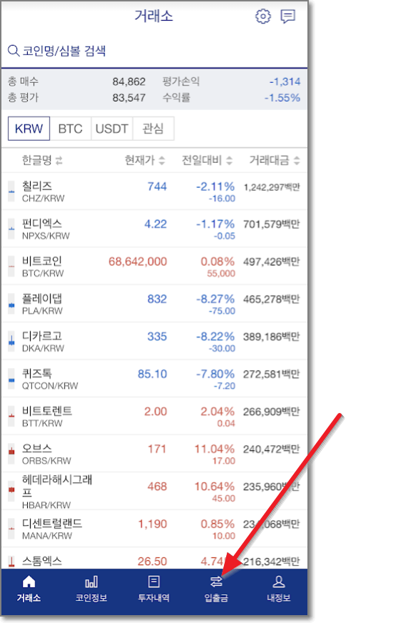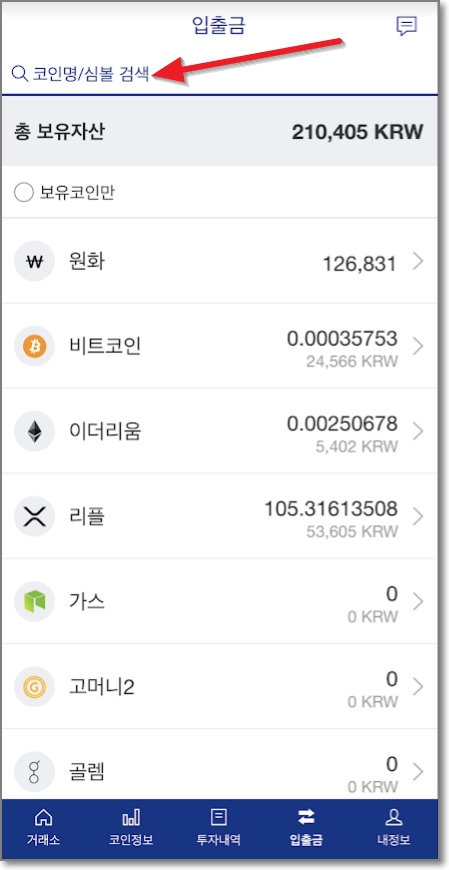 혹시 업비트에 가입이 안되어 있으시다면 "업비트 회원가입 방법 및 코인 거래방법"을 참고해서 업비트에 회원가입을 하시면 됩니다. 업비트에 들어가서 아래쪽에 있는 "입출금"을 누르고 "입출금"화면이 나오면 맨 위에 "코인명/심볼검색"을 누릅니다.