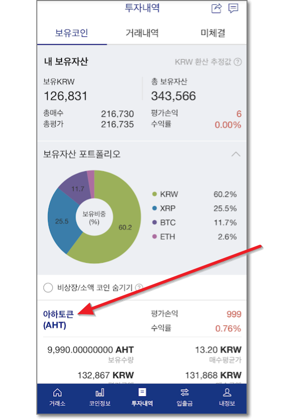 이제 업비트의 "투자내역"쪽으로 가보시면 아래처럼 아하토큰을 9990개 보유하고 있으며 현재 132,867원인 것을 보실 수 있습니다.