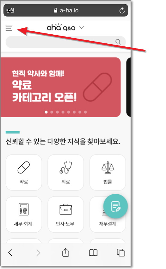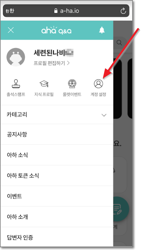 아하토큰을 출금하기 위해서는 당연히 아하에 먼저 접속을 해야겠지요. 아하 바로가기로 아하로 들어갑니다. 화면 왼쪽 위에 줄 세 개(햄버거)를 눌러서 로그인을 한 다음 "계정 설정"을 누릅니다.