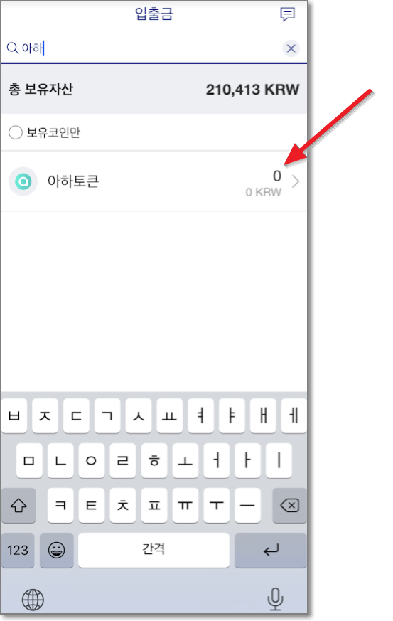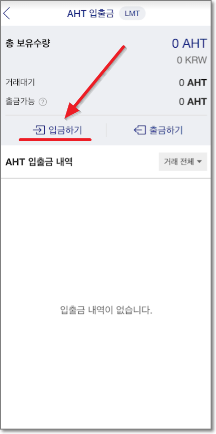 검색창에 "아하"라고 치면 바로 밑에 "아하토큰"이 나오는데요. 아하토큰을 누르면 오른쪽처럼 "AHT 입출금(LMT)"라고 나오는데요. LMT는 신경 안 쓰셔도 되며, 바로 밑에 "입금하기"를 누릅니다. 꼭 "입금하기"를 누르셔야 됩니다.