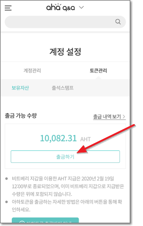 계정 설정 화면에서 "토큰 관리"를 누르고 출금 가능 수량이 보이면 바로 밑에 있는 "출금하기"를 누릅니다.