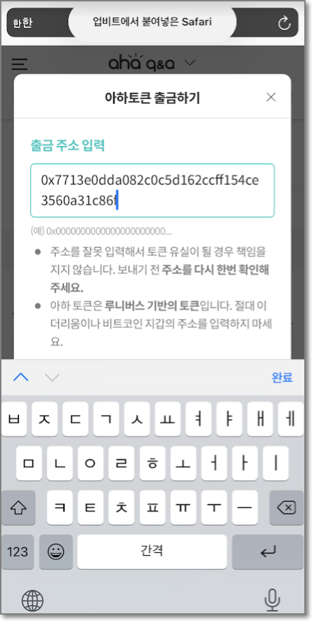 복사를 하면 "주소복사완료"가 뜨며, "닫기"를 누르고 다시 아하 사이트로 넘어가서 "출금 주소 입력" 빈칸에 주소를 붙여 넣기 합니다.