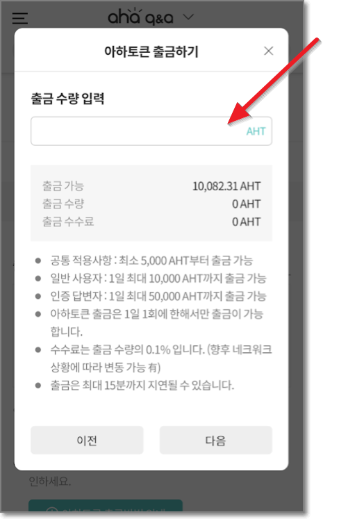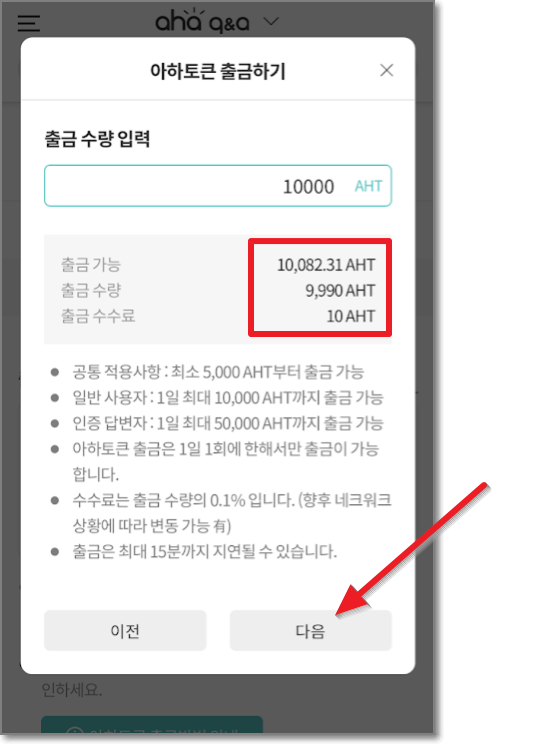 출금 주소를 입력하셨으면 "다음"을 누르시고 "출금 수량 입력"칸을 눌러서 원하는 출금 수량을 입력합니다. 일반 사용자는 1일 1회 10000 AHT가 최고이고 수수료는 10 AHT입니다. 즉 9990 AHT를 출금할 수 있습니다.