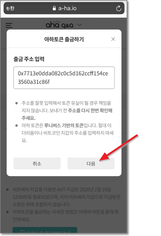 📢 위 주소는 제가 오랜기간 업비트 아하토큰에 접속하지 않아서 사라졌습니다. 만약 위주소로 잘못 송금하시면 토큰이 사라질 수도 있으니 주의하시기 바랍니다. (2023년9월6일 추가)