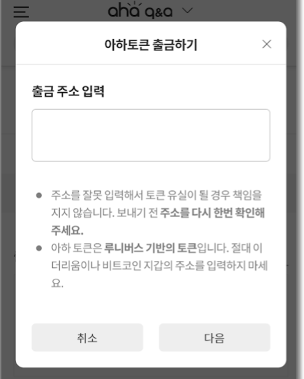 아래처럼 "아하토큰 출금하기"라고 나오는데요. 여기에 "출금 주소 입력"이라는 빈칸이 나옵니다. 이곳에 출금 주소를 입력해야 하는데요. 출금 주소는 "업비트"에서 알아내야 합니다.
