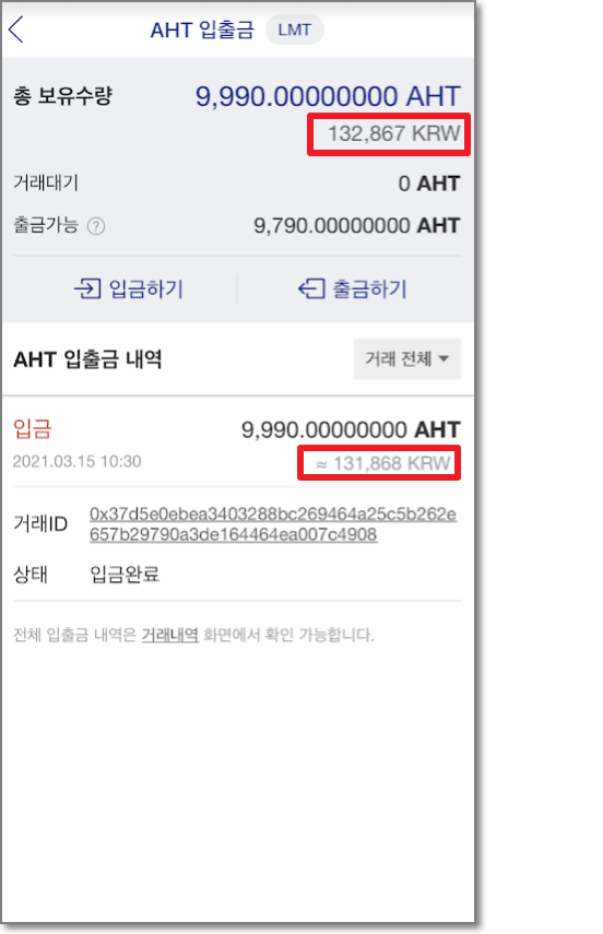 30분이 지나고 난 후 업비트로 입금이 되었습니다. AHT 코인의 형태로 입금이 되었으며 거래소에서 팔면 현금이 되는 것입니다. 잘 보시면 입금 당시 10:30에는 131,868원이었는데 몇 분 안 지난 현재 132,867원인 것을 보실 수 있습니다. 코인이 좀 더 오를 수도 있고 떨어질 수도 있으니까 팔고 안 팔고는 본인의 선택입니다.