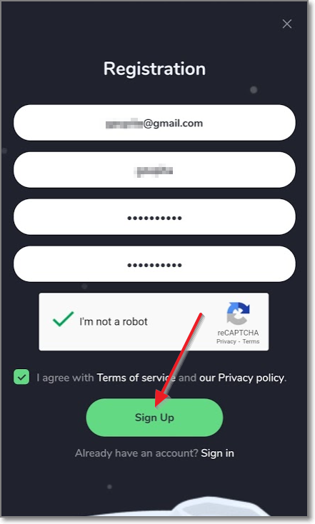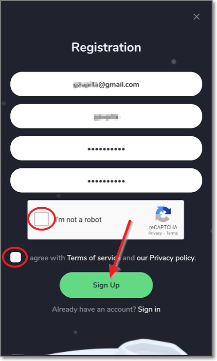 우선 wowdoge에 접속해서 가입(Sign in)을 누르고, 바로 나오는 Registration화면에서 이메일과 아이디 비번을 2번 똑같이 적고 "로봇이 아닙니다.(I'm not robot)"에 체크하고 I agree with Terms of service and our Privacy policy를 체크합니다.(비밀번호에는 대문자가 한 번은 들어가야 합니다)