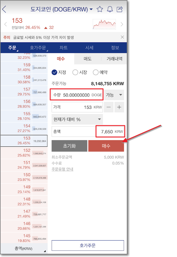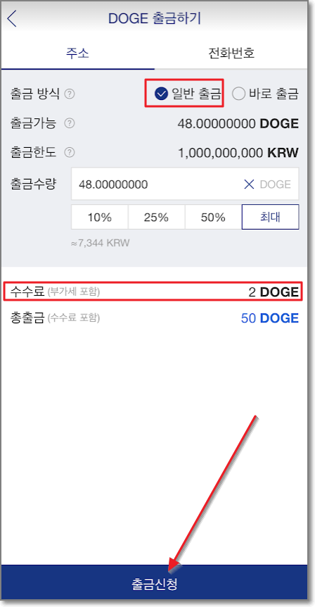 그럼 이 사이트가 진짜인지 확인을 해볼까요? 우선 업비트에서 도지 코인을 50개 사보겠습니다. 이 포스팅을 쓸 때의 도지 코인 시세는 153원이었습니다. 50개만 사서 출금을 해보려고 하니 수수료가 2 코인 들어가네요. 출금신청을 누릅니다.