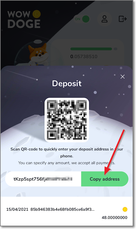 아래 화면에서 Deposit(디파짓)이 입금이고, Withdraw(위드로)는 출금입니다. 디파짓을 누르면 QR코드와 주소가 나오는데요. 녹색 Copy address(주소 복사하기)를 누릅니다.