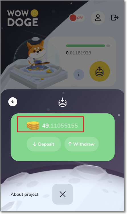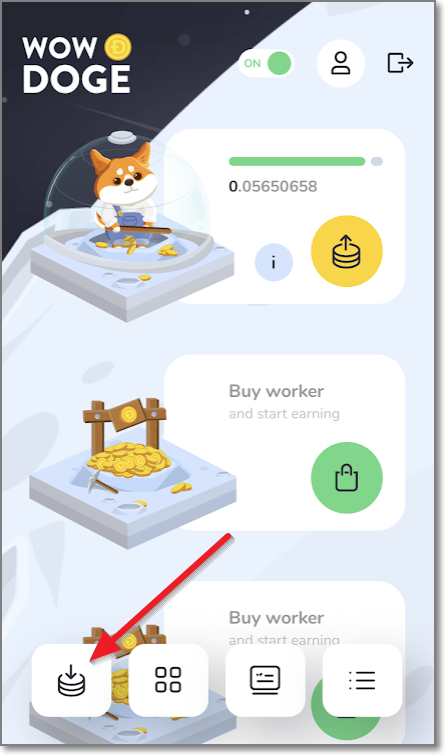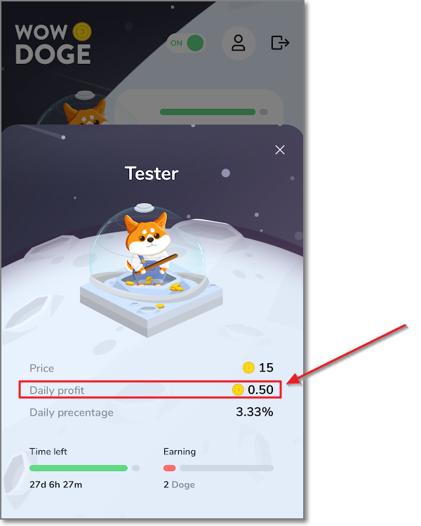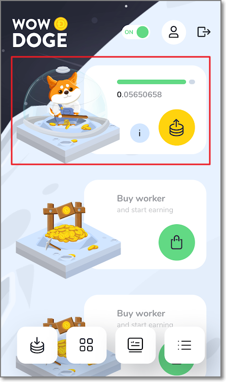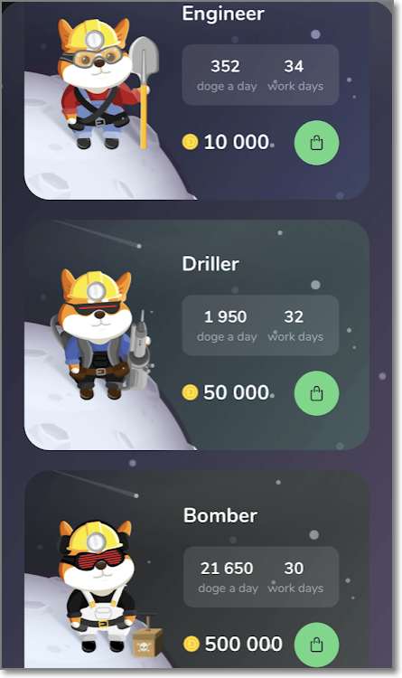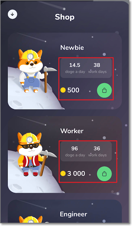 방금 얻은 채굴자는 이름이 Tester로 하루에 캘 수 있는 도지의 양은 0.5도지입니다. 휴대폰이나 컴퓨터를 켜놓지 않아도 알아서 하루에 0.5씩 커지지만 수명이 30일입니다. 총 15도지를 캐고 은퇴하겠네요. 능력이 좀 있는 채굴자는 도지 코인으로 구매를 할 수 있습니다. Newbie(신참)은 500도지로 구매할 수 있으며 매일 14.5도지씩 38일을 채굴하고 은퇴합니다.(채굴하는 총 도지는 551도지이고 구매 가격이 500도지이니 51도지가 수익이네요. 도지 가격을 160원으로 계산해보면, 8160원이 수익입니다.) Worker는 같은 방식으로 계산해보면 72960원이 수익입니다.(초기 비용은 48만 원이에요)