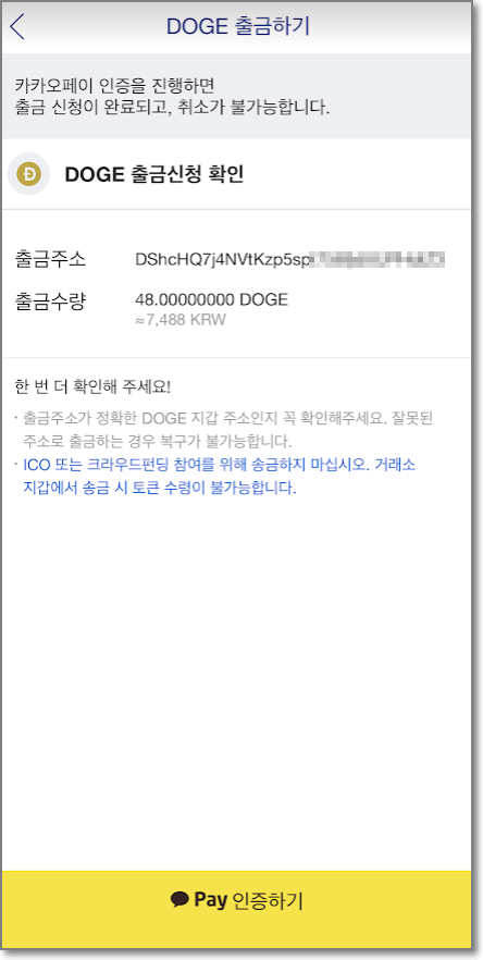 다시 업비트로 가서 출금 주소를 입력하고 확인을 누르면 카카오페이로 인증을 하라고 합니다. 진행합니다.