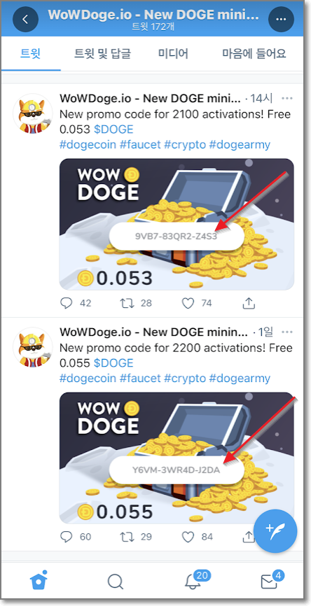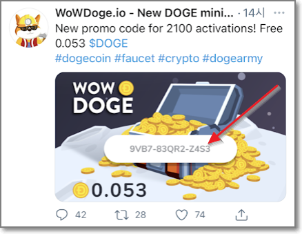 아래처럼 도지 트위터에 가면 하루에 한 번씩 프로모 코드가 뜨는데요. 2100명에서 2200명 정도만 프로모 코드를 얻을 수 있으니 자주 들어가서 보시면 됩니다.