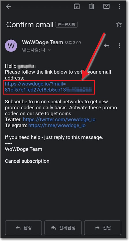 누르는 순간 화면에는 "Confirmation link has been sent to your email"(확인 링크가 이메일로 보내졌습니다.)라고 나오고, 이메일을 열어보면 오른쪽처럼 확인 메일이 오는데요. 이메일 링크 중에서 위에 있는 wowdoge로 시작하는 링크를 누르면 확인이 완료됩니다.(이메일 주인이 맞는지 확인하는 절차입니다.)