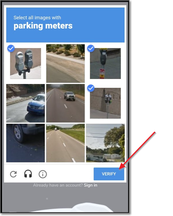 로봇이 아닌 것을 증명하는 방법으로 이번에는 주차미터기를 고르라고 하네요. 모두 고른 후에 VERIFY(확인)을 누르고 Sign Up(회원가입)을 누릅니다.