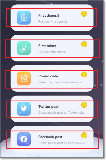 아래를 보시면 보상을 주는 퀘스트가 몇 개 더 있는데요. 맨 위에 First deposit은 첫 입금으로 2도지를 줍니다. 그리고 First withdraw도 2도지를 주며, 이중에 프로모 코드(promo code)는 도지 트위터에 가면 가끔 뜨는 것을 적으면 됩니다.