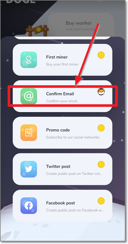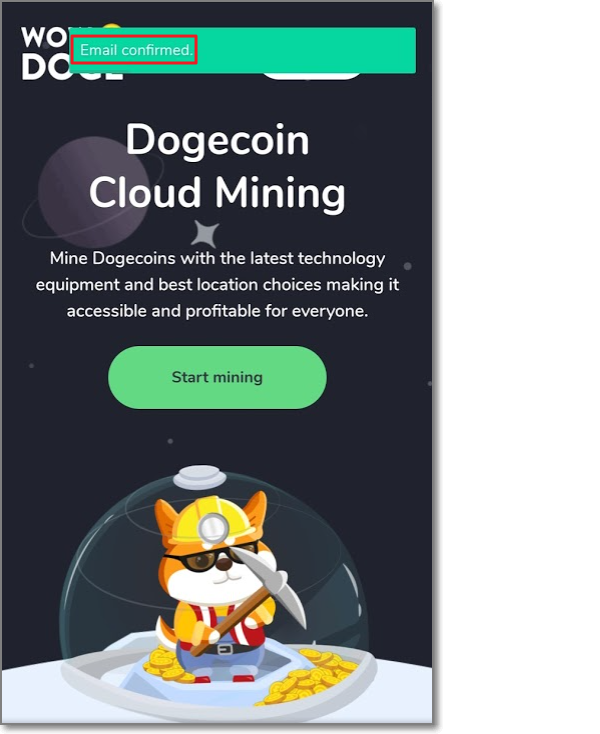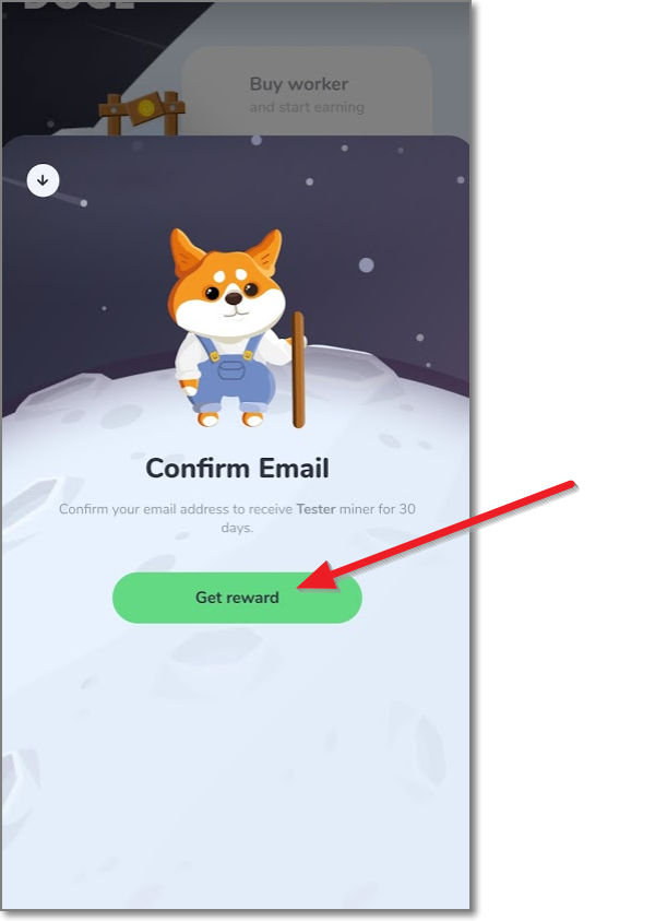 이메일 확인(Confirm Email) 밑에 Get reward(보상받기)를 누르면 오른쪽처럼 귀여운 도지 한 마리가 나무 막대기로 도지 코인을 채굴하기 시작합니다.