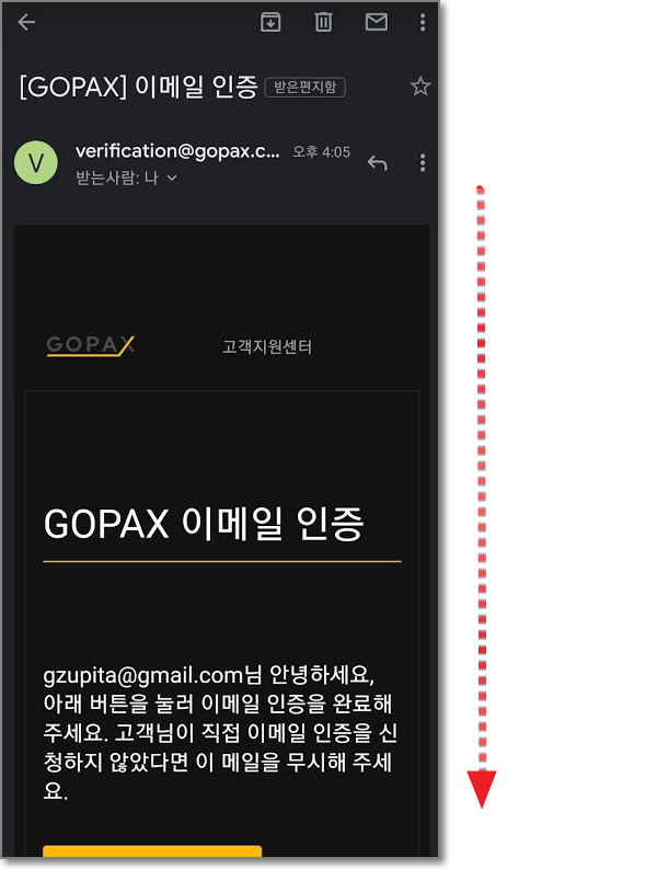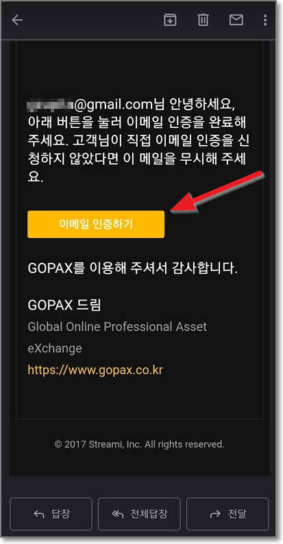 이메일을 열어보면 고팍스(GOPAX)에서 온 이메일이 있을 텐데요. 열어보면 "GOPAX 이메일 인증"이라고 쓰여있습니다. 화면을 좀 내리면 노란색의 "이메일 인증하기"가 있습니다. 이 것을 눌러줍니다.