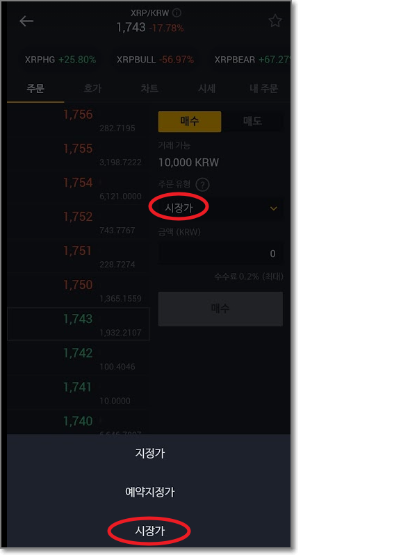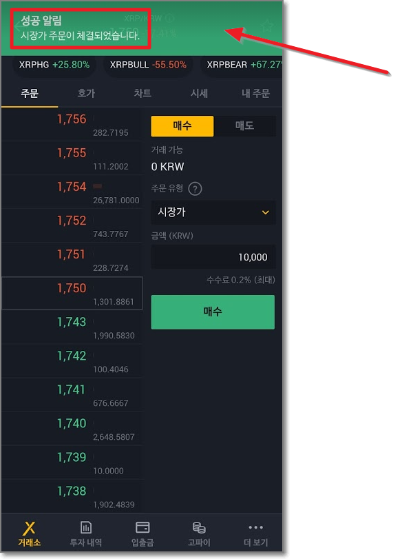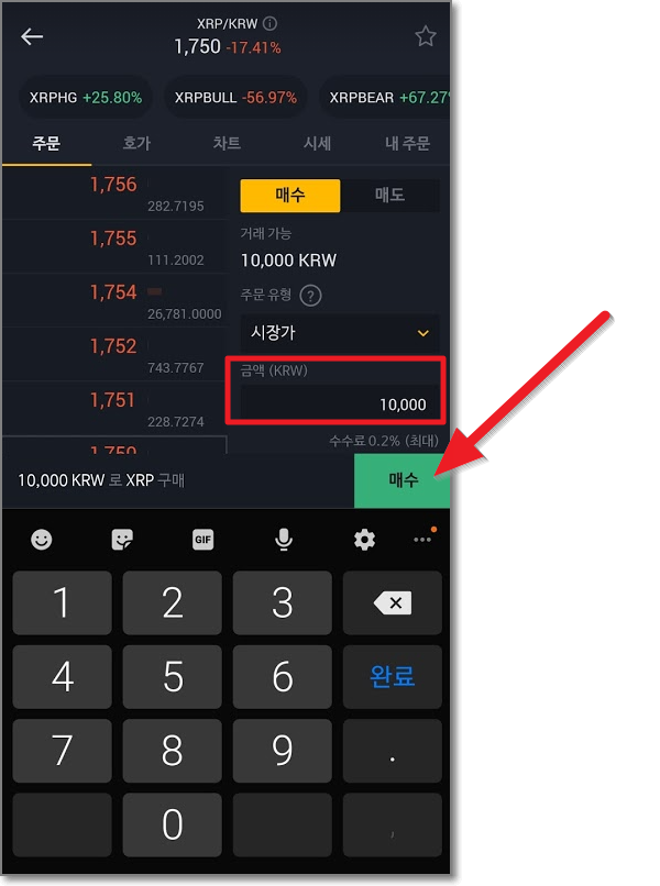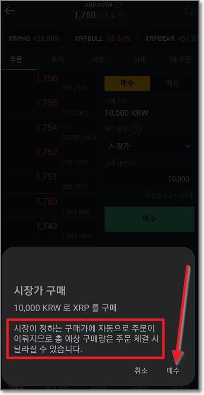 시장가로 구매할 때는 오로지 "금액"만 입력할 수 있게 나오는데요. 이는 시장가가 주문수량은 시장 가격으로 바로바로 바뀌면서 매매를 하기 때문입니다. 빨간 박스 친 곳을 보시면 "시장이 정하는 구매가에 자동으로 주문이 이뤄지므로 총 예상 구매량은 주문 체결 시 달라질 수 있습니다"라고 쓰여 있습니다. 예를 들면 현재 1750원인 리플이지만 실시간으로 1755원, 1760원 이런 식으로 오르고 있을 때 시장가로 사면 내가 원하는 가격은 아니었지만 시장 가격(바로 사지는 가격)으로 매매가 이루어집니다. "매수"를 누릅니다.