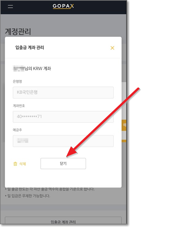 이제 드디어 계좌까지 등록이 되었습니다. "닫기"를 누르고 고팍스 앱에서 밑에 줄에 있는 "입출금"을 누르고 KRW원화를 누른 다음 "입금"을 누릅니다.