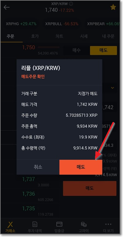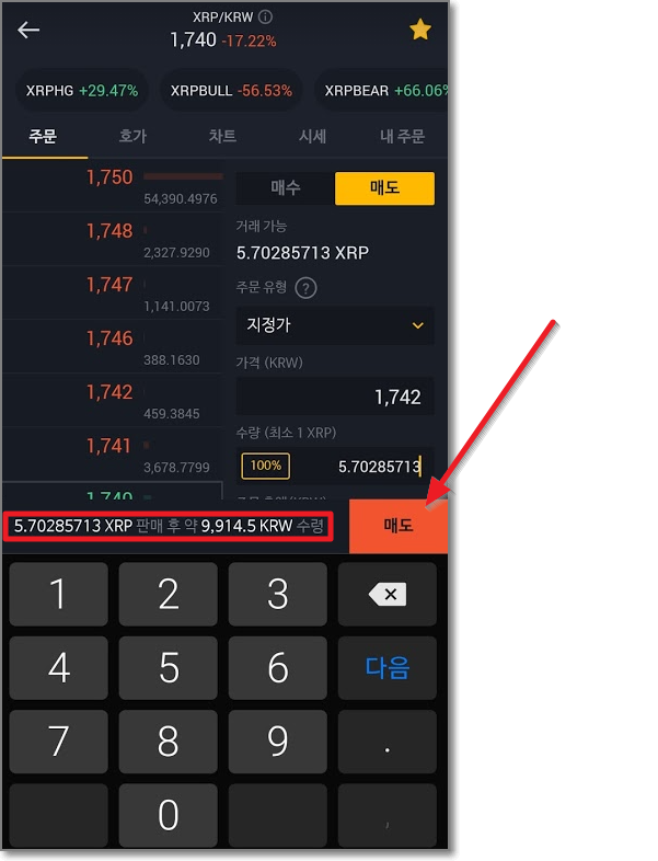 아주 친절하게 5.70285713 리플(XRP)을 1742원에 팔게 되면 9914.5원이 생길 것이라고 알려줍니다. 빨간색 "매도"를 누르고 매도주문 확인을 한번 다시 보여주면 다시 "매도"를 누릅니다.