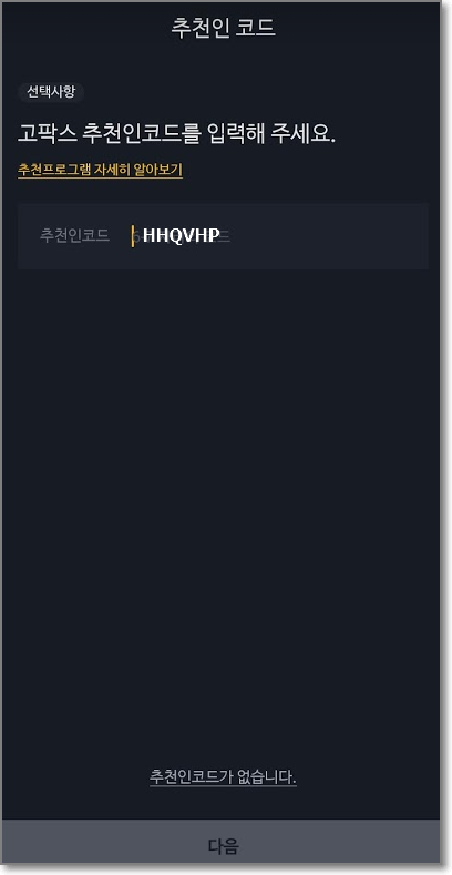 처음 앱을 설치하면 간혹 한 번 더 추천인 코드를 물어볼 때가 있는데요. HHQVHP (에치에치 큐브이 에치피)로 입력해주시면 매우 감사하겠습니다.