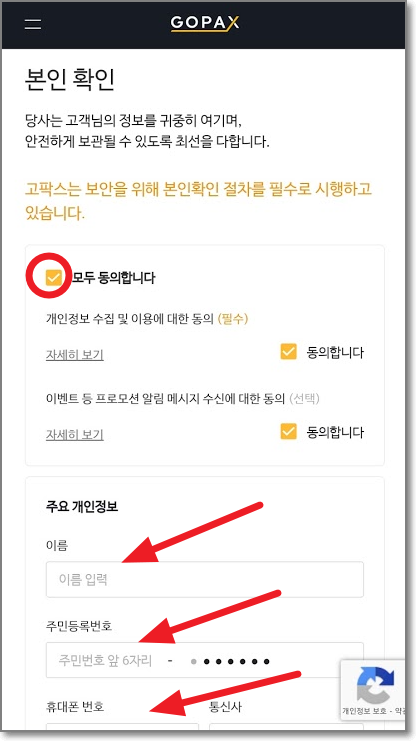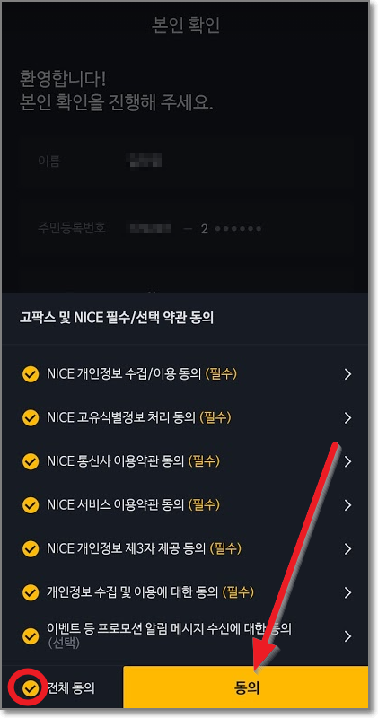 앱에서 새로 진입하는 것이기 때문에 아까 했지만 한번 더 이름, 주민번호, 휴대폰 번호를 누르고 인증을 받고 나서 고팍스 및 NICE필수/선택 약관 동의에 "전체 동의"를 체크하고 "동의"를 누릅니다.