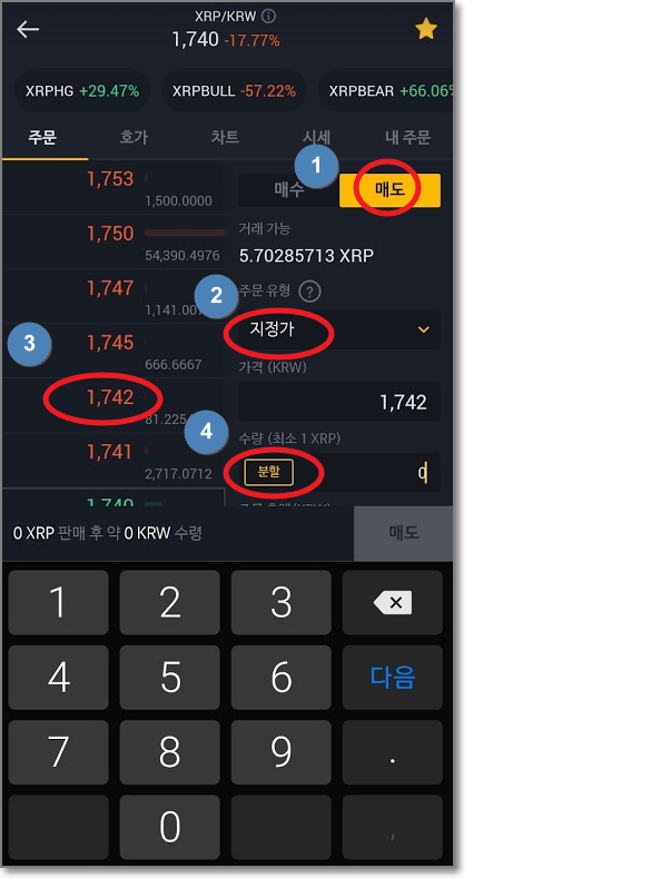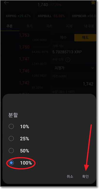 매도가 파는 것이라고 위에서 말씀드렸는데요. 해당 코인(여기서는 리플) 거래 화면으로 가서 "매도"를 누르고, "주문유형을 지정가로 선택"하고 왼쪽에서 팔릴 것 같은 가격을 누른 후에 수량을 터치해서 분할이 나오면 100%로 선택하고 "확인"을 누릅니다.