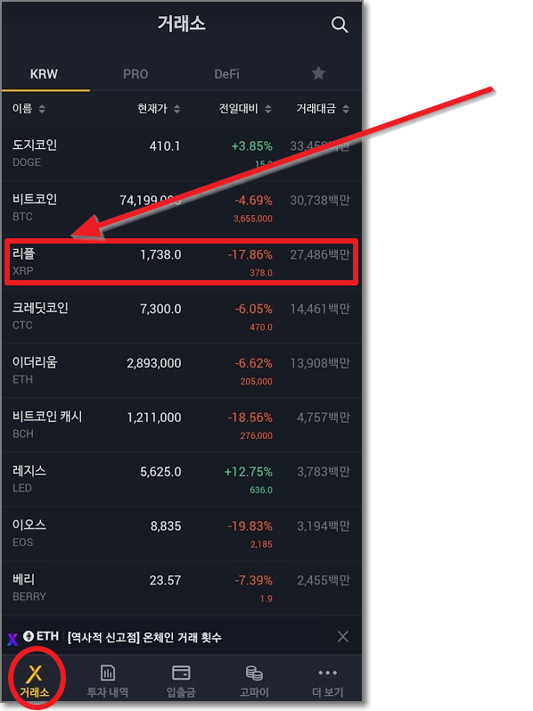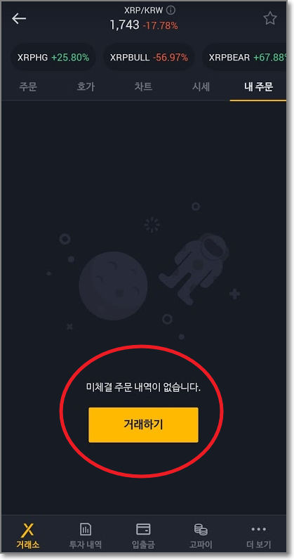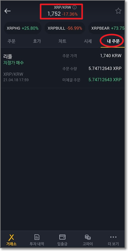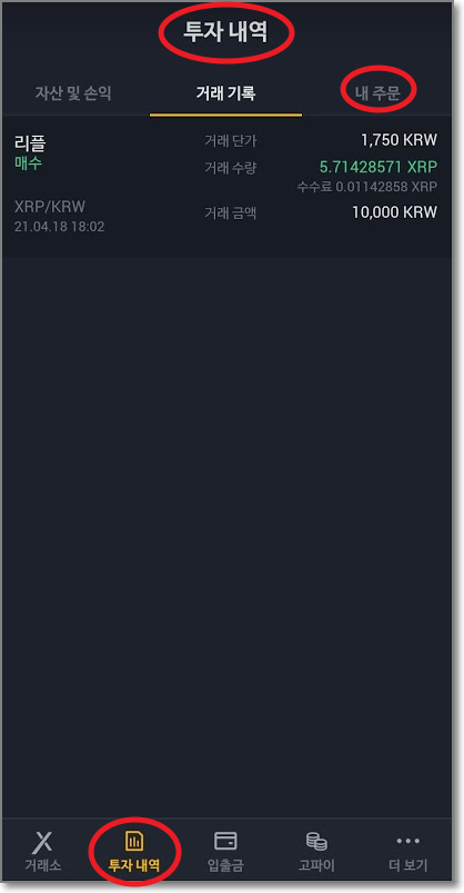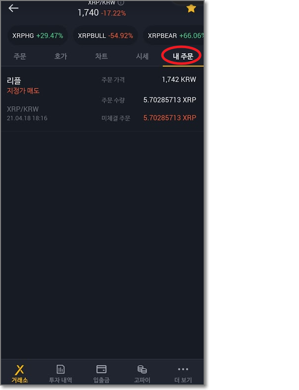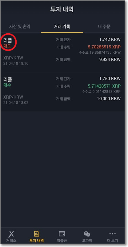 내주 문을 보면 "지정가매도"가 보이는데요. 다행히 1742원에 도달을 해서 팔렸습니다. "투자내역"의 거래기록 탭을 보면 리플이 매도가 된 것을 볼 수 있습니다.