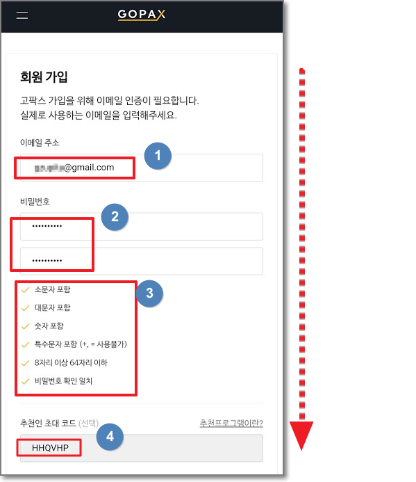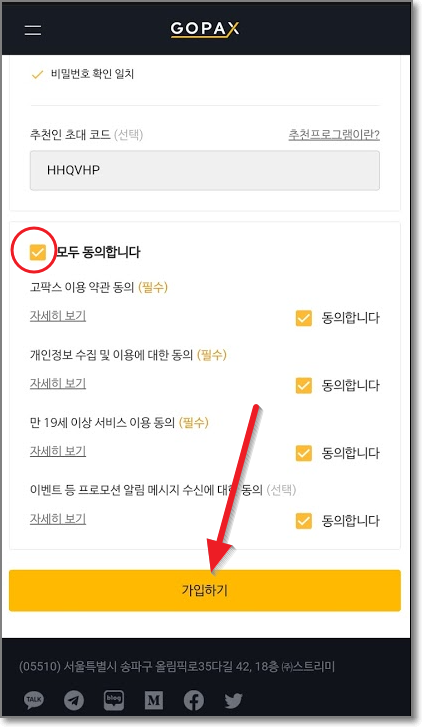 회원가입창이 나타나면 이메일 주소를 쓰시고 비밀번호를 입력해야 하는데요. 비밀번호 만드는 법이 조금 까다롭습니다. 반드시 영어 소문자, 대문자 그리고 숫자와 특수문자까지 포함해야 하고 8자리 이상이어야 합니다. 예를 들어서? xFr9 nue처럼 만드시거나! A#gQ8 fc 만드시면 됩니다. 비밀번호를 만드셨으면 사진을 찍어놓거나 종이에 적어놓으세요. 그리고 아래 보시면 이미 추천인 초대 코드(HHQVHP)가 입력되어 있을 것입니다. 제 추천인 코드인데요. 마음에 들지 않으시다면 다른 분 초대 코드를 쓰셔도 괜찮습니다만 가급적 제 것을 써주시면 매우 감사하겠습니다. 초대 코드까지 보셨으면 밑으로 화면을 내려서 "모두 동의합니다"에 체크하고 "가입하기"를 누르시면 됩니다.
