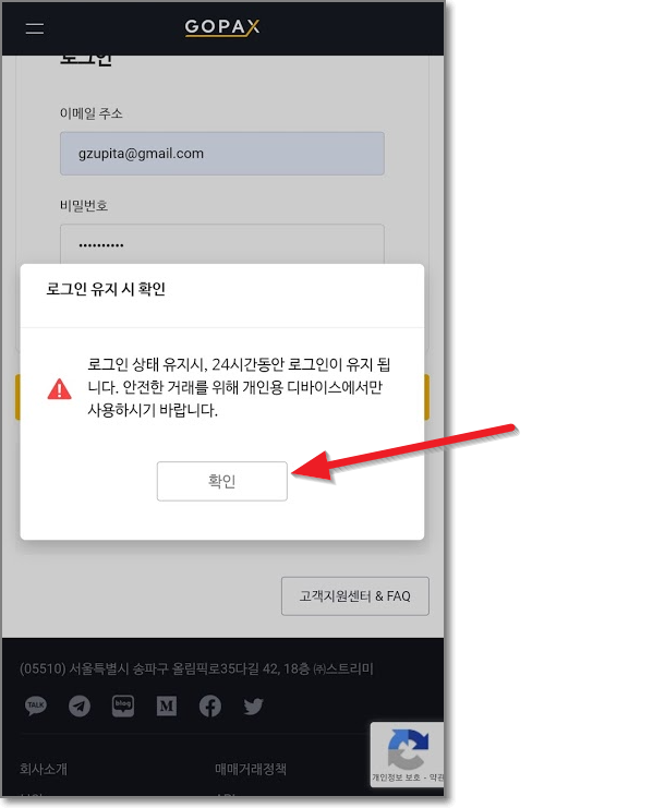 로그인 유지는 24시간만 유지됩니다. (하지만 앱을 설치하면 항상 유지가 됩니다.) 일단 이메일과 비밀번호가 입력된 상태에서 "로그인"을 다시 누릅니다.