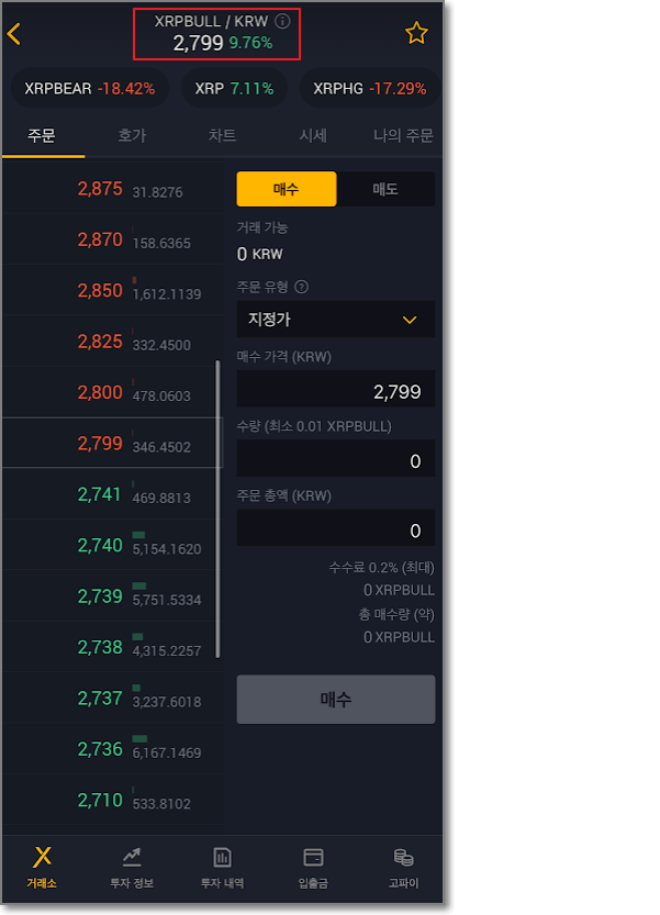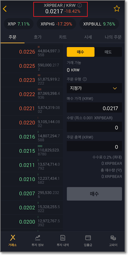 단순하게 아래의 화면을 보면 왼쪽은 불, 오른쪽은 베어이고 심지어 오른쪽 베어는 가격이 0.0225원으로 매우 작습니다.