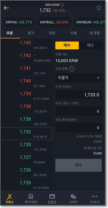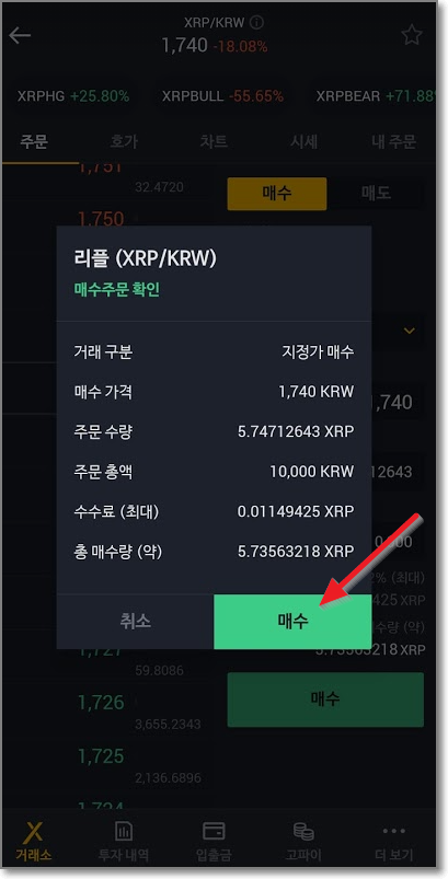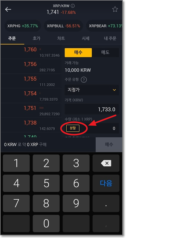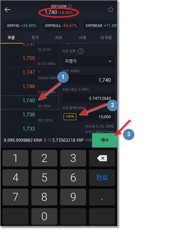 그런데 그새 리플의 거래 가격이 변해서(아래 그림 위에 1740 참고) 왼쪽에서 1740을 터치하고 다시 분할을 100%로 맞춘 다음 초록색 "매수"버튼을 눌렀습니다. 한번 더 매수주문을 확인하고 "매수"를 누릅니다.