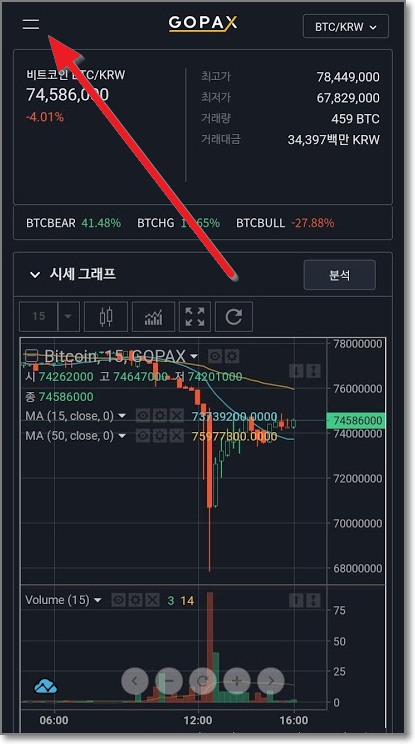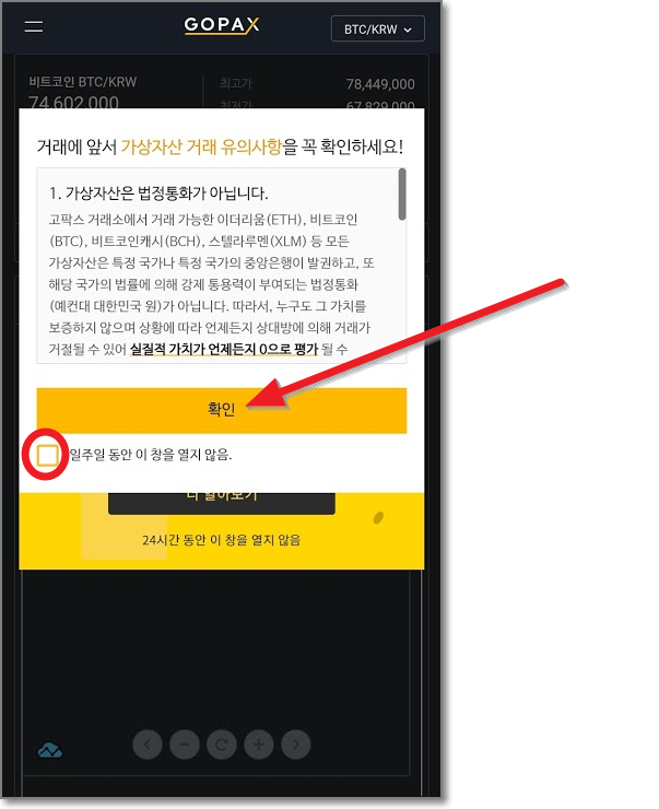 고팍스 사이트로 가게 되는데요. 조금 무서운 글이 보이죠? "실질적 가치가 언제든지 0으로 평가"될 수도 있습니다.라고요. 이 말은 비트코인이 내일 당장 1억이 돼도 이상하지 않으며, 거꾸로 내일 당장 0원이 되어도 이상할 게 없으며 아무 기관에서도 이를 보장해주지 않는다는 말입니다. "일주일 동안 이 창을 열지 않음"에 체크하시고 "확인"을 누르면 고팍스 메인화면이 나오는데요. 여기서 맨 위 왼쪽에 있는 줄 두 개를 누릅니다.