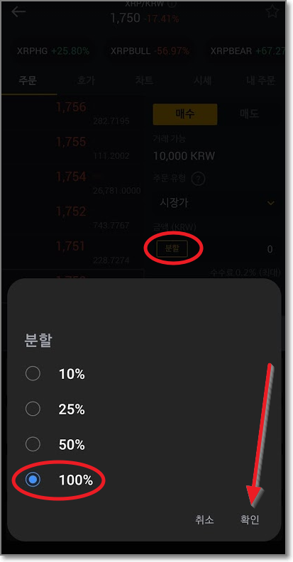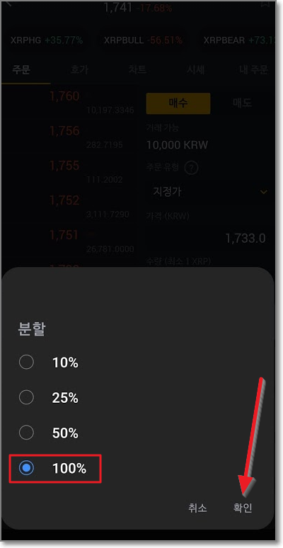 터치를 하면 "분할"이라는 글자가 보일 것입니다. 다시 한번 "분할"을 터치하면 10%부터 100%까지 선택을 할 수 있게 나오는데요. 가진돈의 일부 퍼센트를 코인을 사는데 쓰겠다는 것입니다. 예를 들면 1만 원을 가지고 있는데 50%를 선택하면 5천 원만 코인을 사는 데 사용하겠다는 것입니다. 다시 한번 예를 들면 총 입금된 금액이 만약 200만 원인데 분할을 25%로 선택하면 50만 원만 코인을 사는데 쓰겠다는 뜻입니다. 여기서는 1만 원 모두 쓸 예정이므로 100%를 선택하고 "확인"을 눌렀습니다.