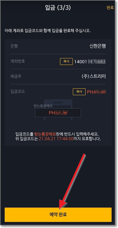 입금금액이 10만 원부터 쓰여있지만 1만 원도 입금이 가능합니다. 1만 원을 쓰고 "확인"을 누르면 아래 오른쪽 화면처럼 보내야 할 은행과 계좌(신한은행 140****) 받는 사람 (주)스트리미라고 나오고 아주아주 중요한 입금 코드가 보입니다. 여섯 자리의 영문으로 나왔는데요. 반드시 기억(복사) 해야 합니다. 이제 "예약 완료"를 누릅니다.