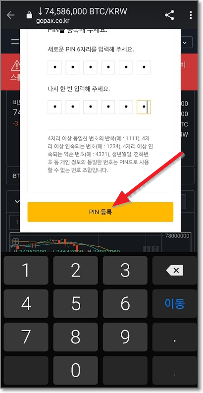 이제 PIN등록을 하라고 합니다. 6자리 숫자를 입력하시면 되는데요. 여기도 역시 제한이 있습니다. 4자리 이상의 동일한 번호는 반복하면 안 되며 4자리 이상 연속되는 번호도 안됩니다. 즉 6자리 중에 222235나 234585 이런 식의 번호는 안되며, 본인의 생년월일이 들어가도 안되고 전화번호가 들어가도 안됩니다. 주의해서 만드시기 바라며 두 번 모두 똑같이 입력하고 나서 PIN등록을 누르시면 됩니다.