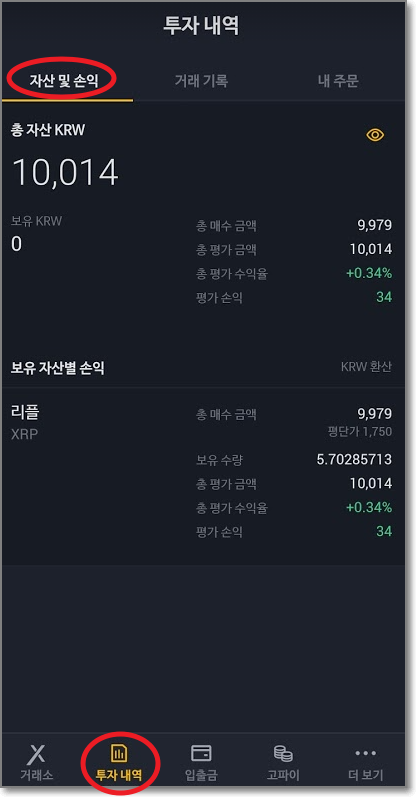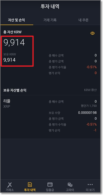 "투자내역"에서 "자산 및 손익"탭을 보면 총자산이 9914원이고 보유 KRW가 9914원인 것을 볼 수 있습니다.