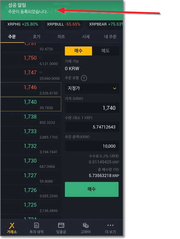 고팍스 앱은 아래처럼 상단에 알림이 오는데요. "주문이 등록된 것에 대한 알림"입니다. 팔린 게 아니에요. "내 주문"을 눌러보면 1740원에 사겠다고 주문을 내놓은 것이 보이는데요. 상단 리플 가격을 보면 1752원입니다. 당장 사 지지 않고 1740원에 도달해야 사 지게 되는 것입니다.