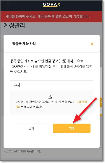 바로 1원이 등록한 계좌로 송금되는데요. 입금자명이 GOPAX***으로 뒤에 세 자리가 적혀서 입금됩니다. 저는 242라고 붙어서 왔습니다. 즉 "GOPAX242님이 1원을 입금했습니다."라고 나왔습니다. 뒤에 숫자를 입력하고 "인증"을 누릅니다.