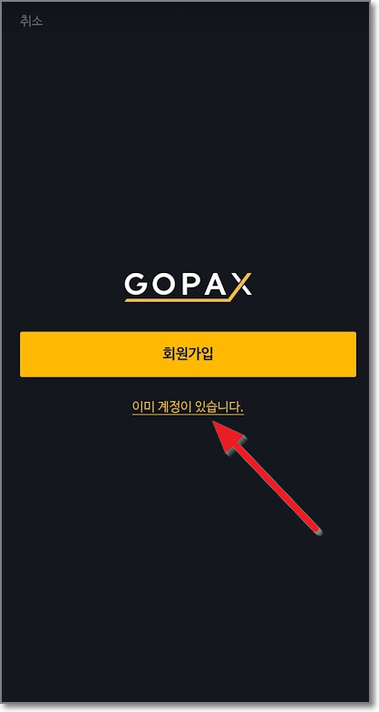 앱을 설치하고 실행하면 아래처럼 GOPAX 앱이 열리는데요. 여기서 "이미 계정이 있습니다"를 누릅니다.